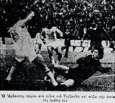 * Στην αρχική εικόνα διακρίνεται ο Σαράφης σε μια επιθετική προσπάθεια του ΠΑΟΚ, να σουτάρει από καλή θέση, αλλά ο Αρβανίτης να αποκρούει.